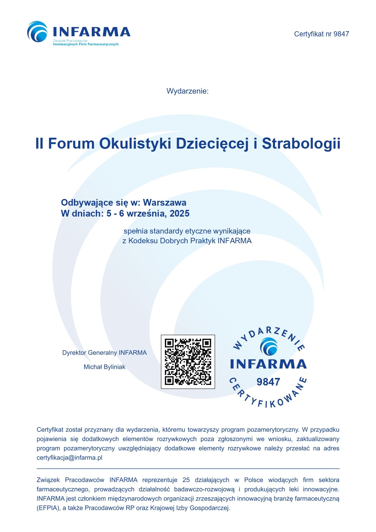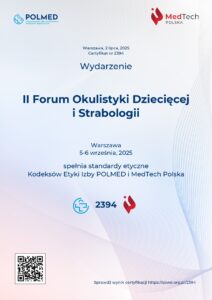 Serdecznie zapraszamy do udziału w drugiej edycji Forum Okulistyki Dziecięcej i Strabologii, które odbędzie się w dniach 5-6 września 2025 roku w Centrum Konferencyjno-Szkoleniowym Hotelu Boss w Warszawie, (ul. Żwanowiecka 20). Organizatorem Forum jest Klinika Okulistyki, Instytut „Pomnik – Centrum Zdrowia Dziecka”.